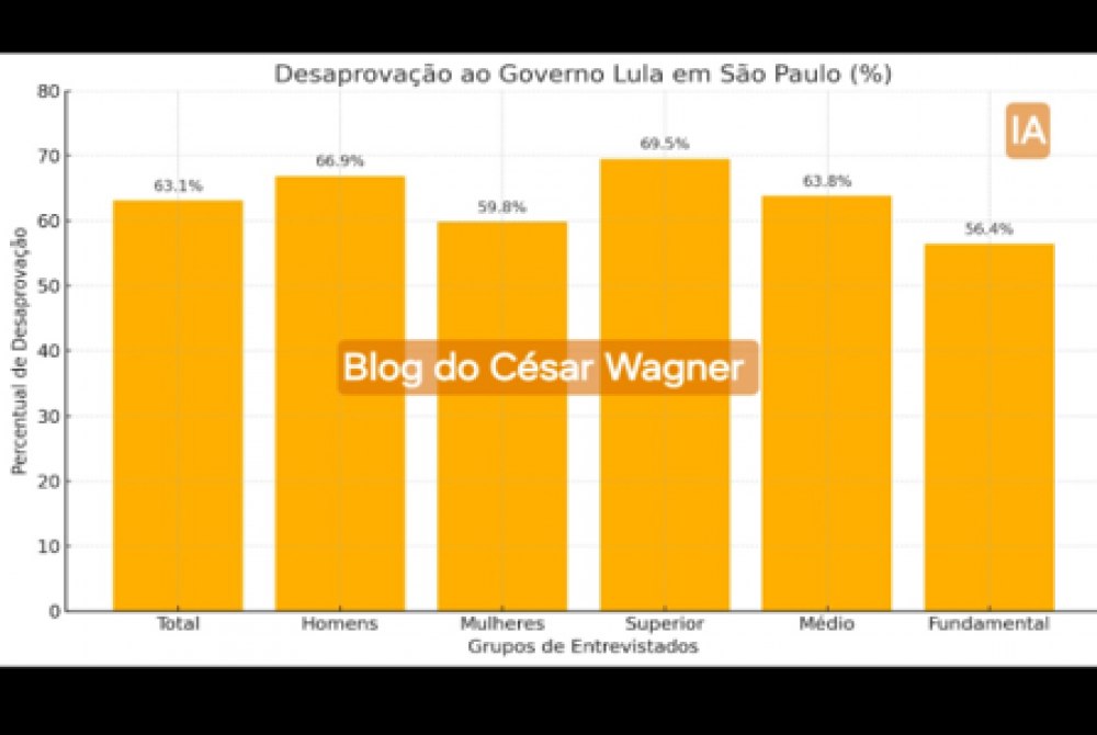 Segundo levantamento do Instituto Paraná Pesquisas divulgado nesta quarta-feira, 7, 63,1% dos paulistas desaprovam o governo do presidente Lula (PT), enquanto 33,9% aprovam; 52,8% consideram sua administração ruim ou péssima, 22,2% a avaliam como boa ou ótima e 1,5% não souberam ou não opinaram. A desaprovação é maior entre os homens (66,9%) do que entre as mulheres (59,8%), e cresce conforme o nível de escolaridade: 69,5% entre quem tem ensino superior, 63,8% entre os com ensino médio e 56,4% entre os com ensino fundamental. A pesquisa entrevistou 1.700 eleitores em 85 municípios de São Paulo, entre os dias 1º e 4 de maio, com margem de erro de 2,4 pontos percentuais e 95% de confiança.