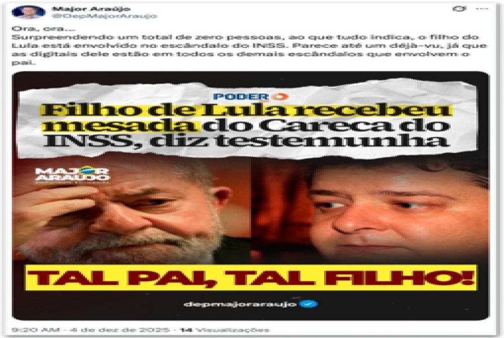 PRISÃO DE VORCARO – Além dos dois parentes de Lula, a deputada Coronel Fernanda protocolou outro requerimento mirando Daniel Vorcaro, dono do Banco Master. Ela pede que a prisão domiciliar do banqueiro seja convertida em preventiva.