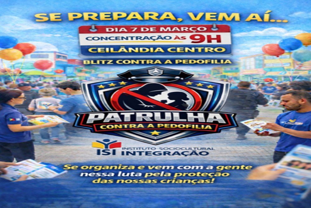 Amanhã, 7/3, na Ceilândia Centro DF, ocorrerá a Patrulha contra a Pedofilia. Mais uma atividade do Instituto Sociocultural Integração ISI, com objetivo de levar o conhecimento a todos a respeito deste tema tão importante para a sociedade que, infelizmente convive com este mal.